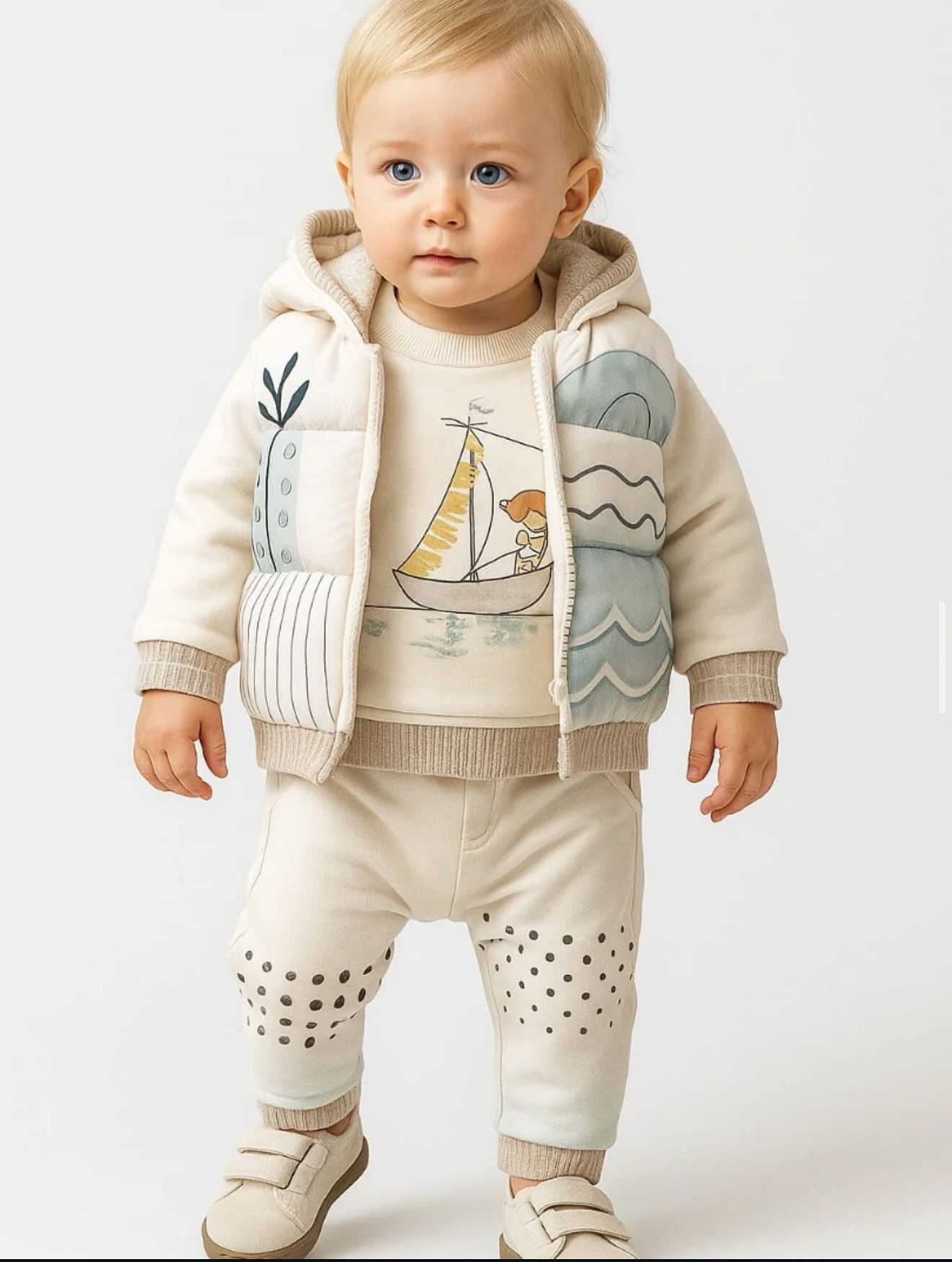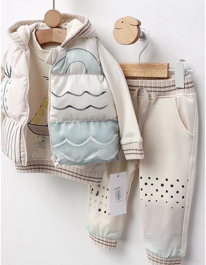 Изключително стилен детски комплект от три части, изработен в красиви пастелни цветове, които придават нежна и модерна визия. Моделът включва елек, блуза и долнище, подходящи за ежедневието, разходки и детска градина.